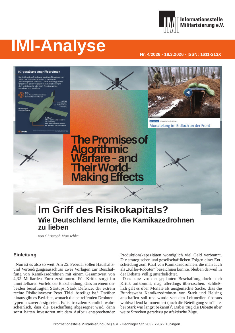 14 Insbesondere zum finanziellen Kontext sei hier auf die IMI-Studie 2025/02 verwiesen, aus der auch einige der folgenden Quellen stammen: Franz Enders: Neue Waffen, neues Geld? „Defence-Startups“ in der BRD, imi-online.de (16.7.2025).
