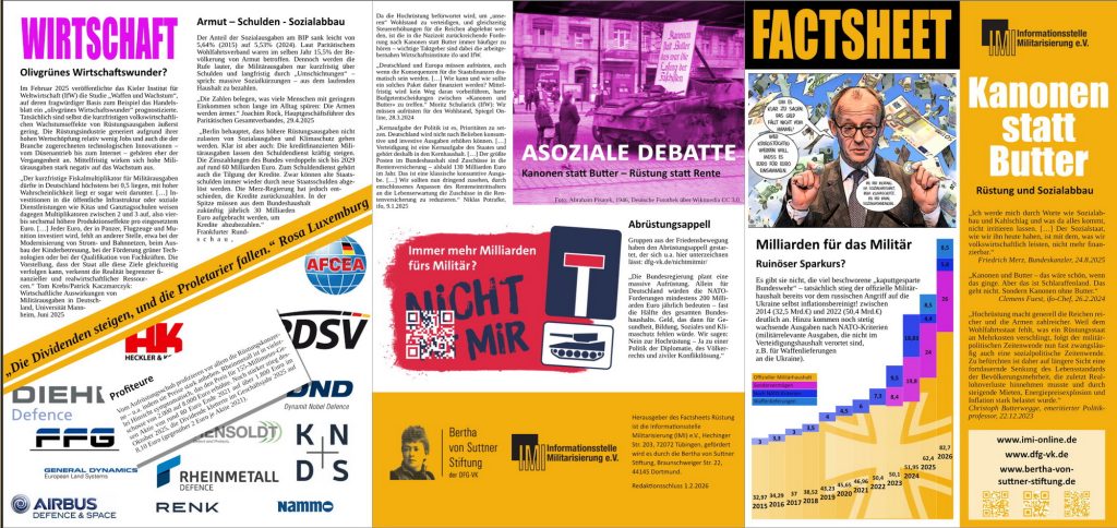 Spätestens seit dem völlig undemokratisch durchgepeitschten Beschluss im Frühjahr 2025, Militärausgaben weitgehend von der sogenannten Schuldenbremse auszunehmen, kennen die Rüstungsbudgets keine Grenzen mehr. Parallel dazu werden die Forderungen, die Sozialausgaben zur Gegenfinanzierung noch weiter zusammenzustreichen, immer unverfrorener. Die Dimensionen der aktuellen Entwicklungen scheinen bei vielen Menschen noch nicht richtig angekommen zu sein, weshalb das neue IMI-Factsheet „Kanonen statt Butter – Rüstung und Sozialabbau“ versucht, wichtige Zahlen und Fakten rund um das Thema zusammenzutragen.